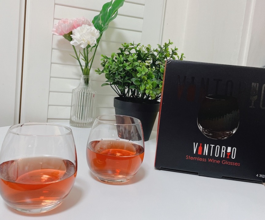 저는 위의 사진에서처럼 구매 후, 한번 닦고 나서 바로 로제 와인을 집에서 즐겼어요. 레드와인, 로제와인 등 와인뿐만 아니라 다양한 음료에 활용할 수 있고, 부담없이 편하게 즐길 수 있는 퀄리티 높은 빈토리오 스템리스 와인잔 완전 마음에 들어요!