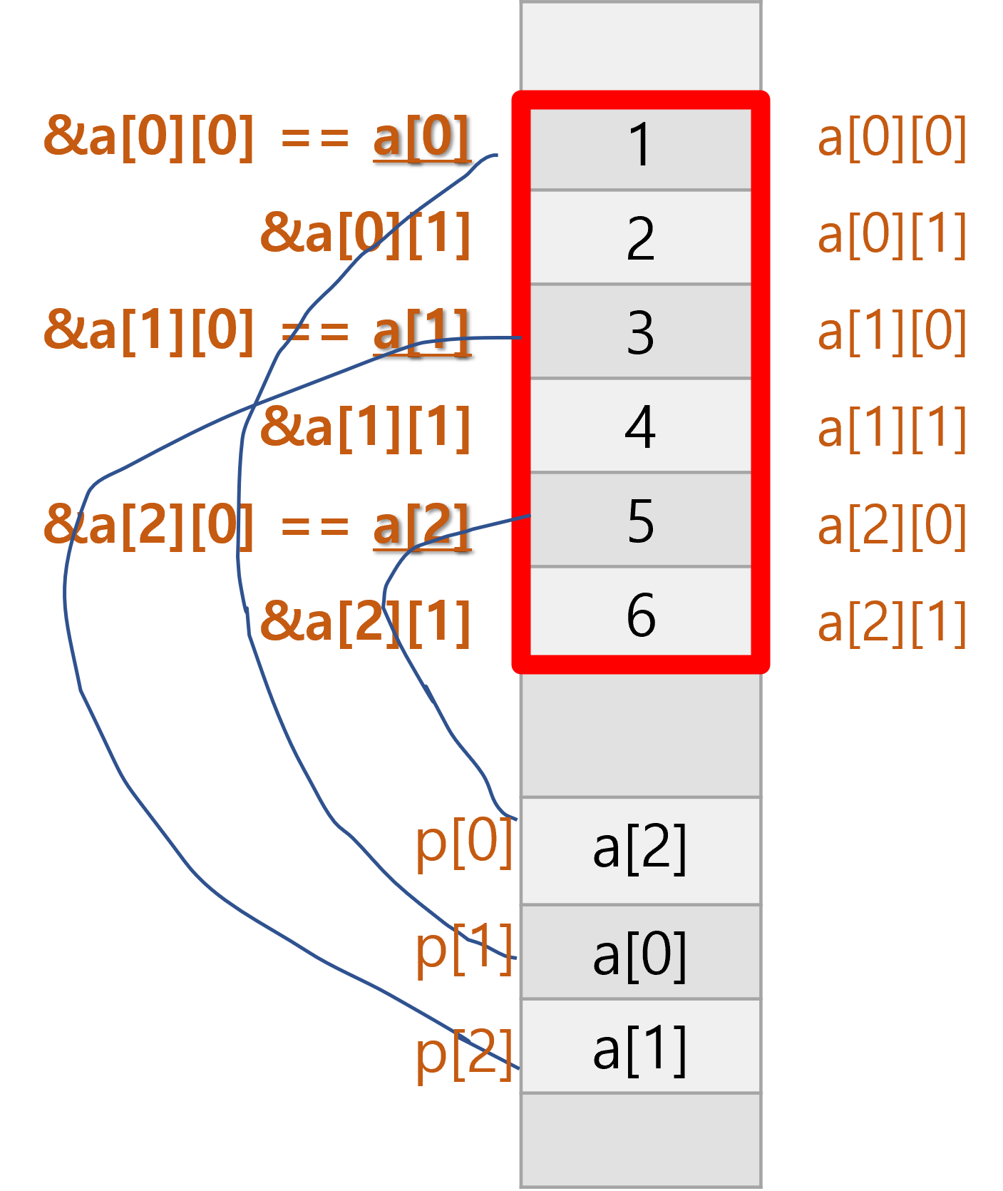 1차원 포인터에 대해 *과 [ ]을 이용해야 값을 가리킬 수 있다. *(a+2) == a[2]