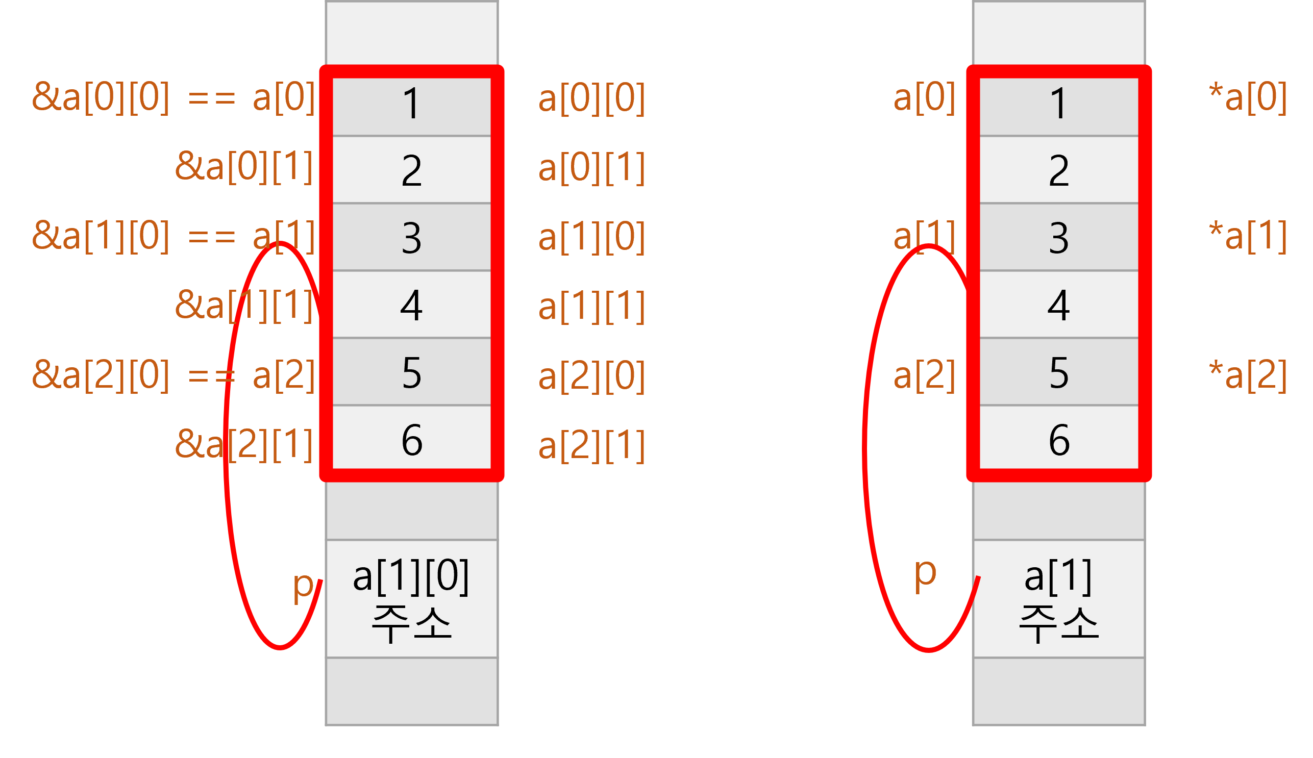 : 2차원 배열에서 배열명만 단독으로 사용할 경우 2차원 포인터와 동일하고,