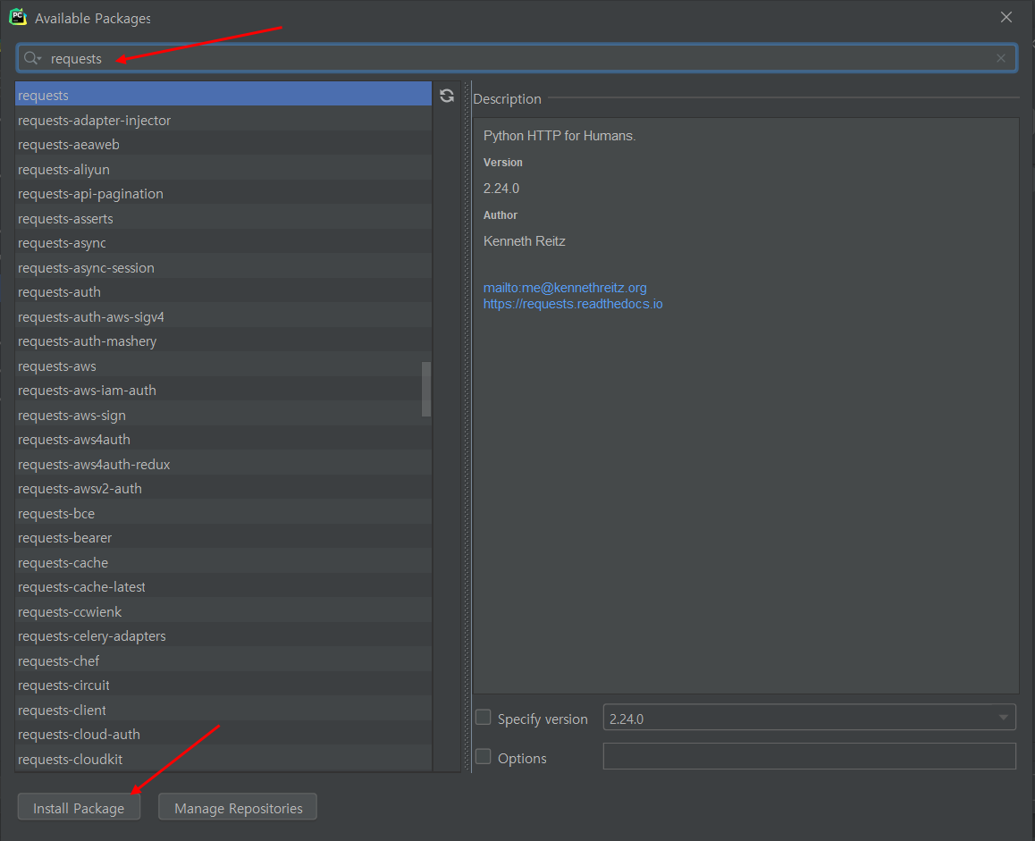 또는 cmd 창이나 코랩, 주피터노트북의 경우 !pip install requests 명령어로 패키지 추가가 가능하다.