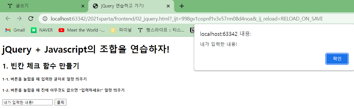[jQuery + Javascript] 입력한 글자 alert 얼럿 띄우기